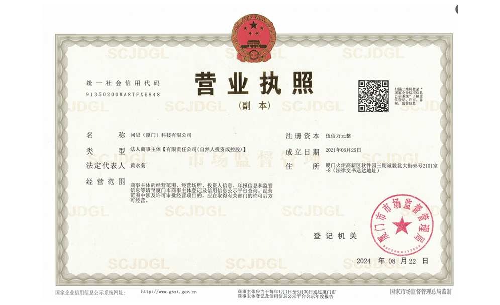 问思的合法经营凭证,注册资本500万元,经营范围包括:计算机软硬件开发、技术服务、技术咨询等。